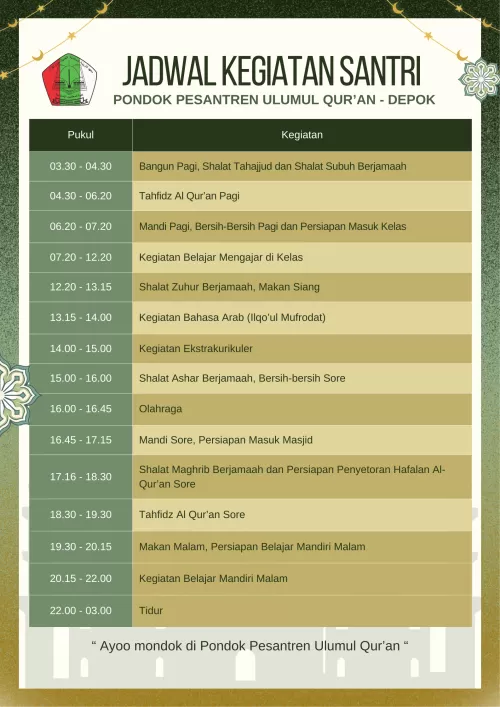 A. Untuk Kegiatan harian santri adalah kegiatan rutin yang dilakukan oleh santri sesuai dengan peraturan dan disiplin santri Pondok Pesantren Ulumul Qur'an.